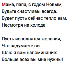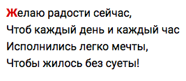 Поздравляю с Новым годом! Желаю, что он принес нам самое долгожданное и желанное. Желаю крепкого здоровья, веры в чудеса и свои силы! Люблю, скучаю и крепко целую!