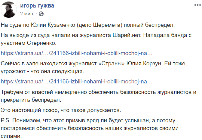 15:24  Главный редактор "Страны" Игорь Гужва пишет об угрозах журналистам на суде по Кузьменко: