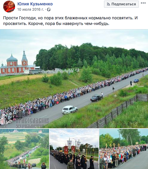 16:10 В 2016 году Юлия Кузьменко публиковала пост с критикой крестного хода прихожан Украинской православной церкви, который был приурочен ко Дню Крещения Руси.