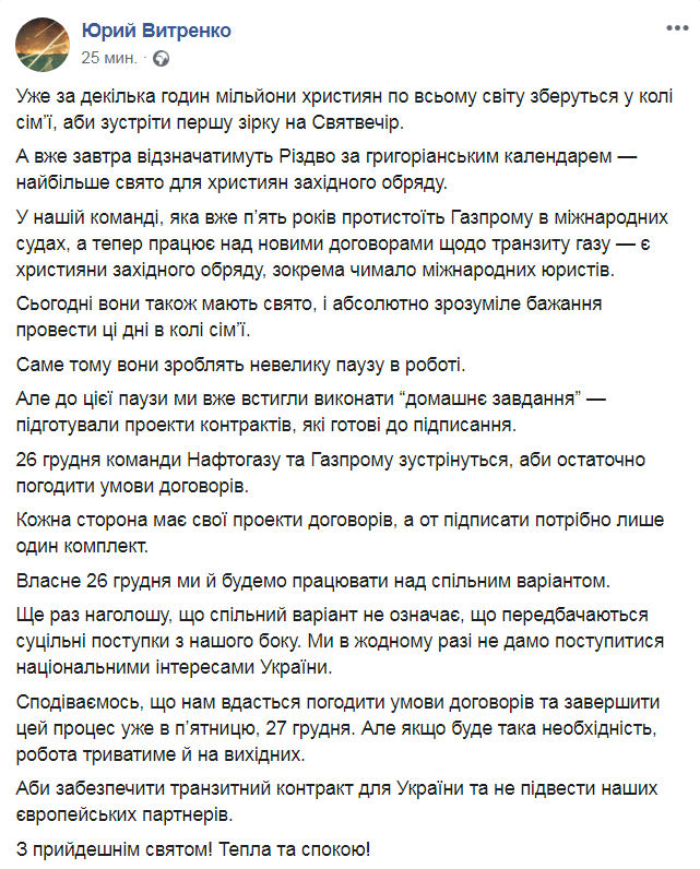 "Мы уже успели выполнить "домашнее задание": подготовили проекты контрактов, которые готовы к подписанию. 26 декабря команды "Нафтогаза" и "Газпрома" встретятся, чтобы окончательно согласовать условия договоров. Каждая сторона имеет свои проекты договоров, а вот подписать нужно только один комплект. Собственно, 26 декабря мы и будем работать над общим вариантом", – написал Витренко в соцсети.