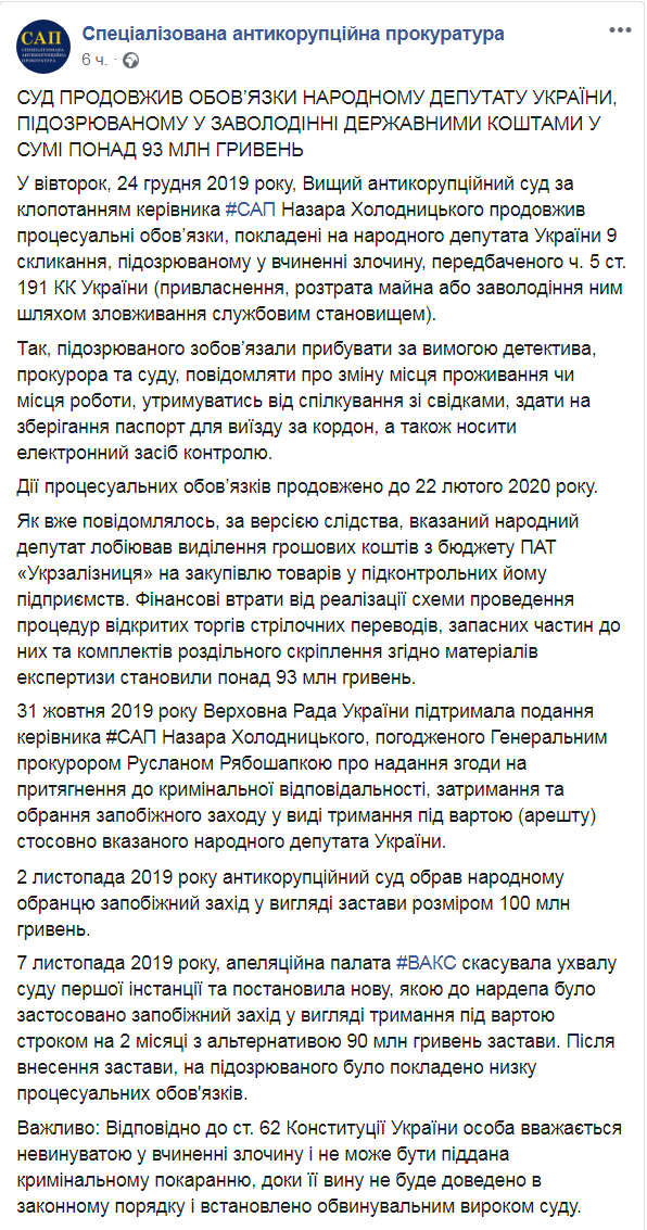 В посте в соцсети говорится, что 24 декабря ВАКС продлил процессуальные обязанности, возложенные на нардепа, по ходатайству руководителя САП Назара Холодницкого.