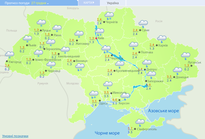 В последнюю пятницу нового года - 27 декабря - погода в Украине будет совсем не зимней. Так, в столице Украины дождь с мокрым снегом, облачно, а также "плюсовая" температура ночью и днем. Такая же ситуация ожидается в большинстве регионов Украины. Об этом говорят данные Укргидрометцентра.
