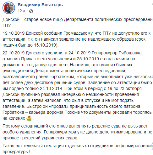 "Донской – старое новое лицо Департамента политических преследований ГПУ. 19.10.2019 Донской сообщил Громадському, что ГПУ не допустило его к аттестации, т.к. он написал заявление не надлежащего образца (срок подачи был до 15.10.2019).