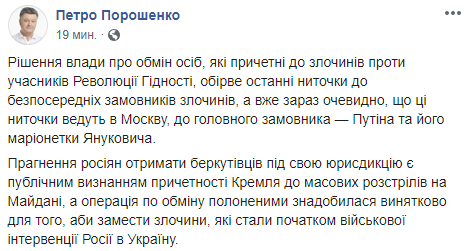 "Стремление россиян получить беркутовцев под свою юрисдикцию является публичным признанием причастности Кремля к массовым расстрелам на Майдане, а операция по обмену пленными понадобилась исключительно для того, чтобы замести преступления, которые стали началом военной интервенции России в Украине", - пишет бывший глава страны.