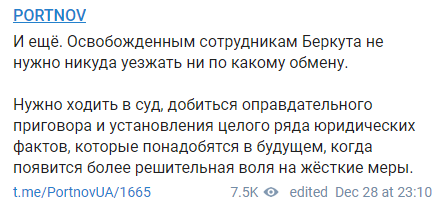 23:45 Тем временем юрист Портнов призвал отпущенных на свободу беркутовцев не идти на обмен, а добиваться оправдательного приговора.
