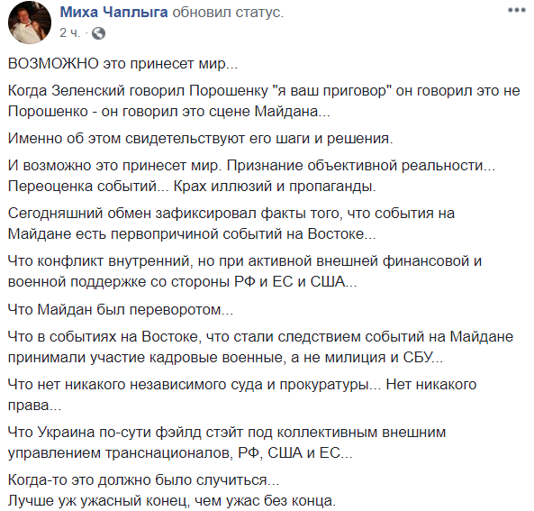 Шанс на мир появится только тогда, когда Зеленский мыслями, словами и делами станет президентом всей страны, а не только её части — майдана. Когда станет президентом и для неподконтрольного Донбасса, а не просто будет говорить дешёвое, что Донбасс — это Украина. Когда мы признаем, что в Украине – гражданская война, что граждане Украины убивают граждан Украины, что освобождаем и меняем граждан Украины на граждан Украины".