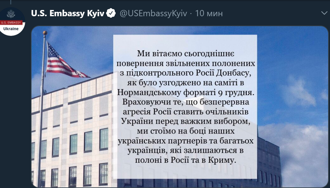 15:43 Посольство США в Украине поприветствовало обмен.