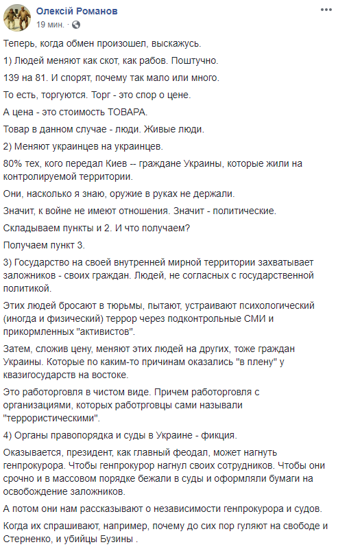 Затем, сложив цену, меняют этих людей на других, тоже граждан Украины. Которые по каким-то причинам оказались "в плену" у квазигосударств на востоке.