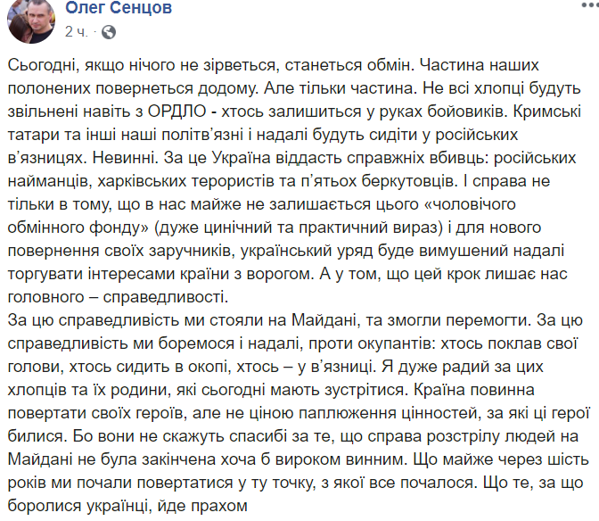 14:11 Бывший заключенный Олег Сенцов, обменянный недавно Зеленским, осудил обмен. Говорит, что все, за что боролись на Майдане, идет прахом.