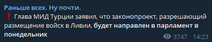 Глава Министерства иностранных дел Турции Мевлют Чавушоглу заявил, что законопроект, который разрешает размещение войск в Ливии, будет направлен в парламент в понедельник, 30 декабря.