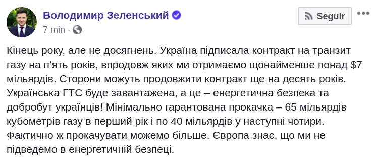 "Украина подписала контракт на транзит газа на пять лет, в течение которых мы получим минимум более $7 млрд. Стороны могут продлить контракт еще на десять лет. Украинская ГТС будет загружена, а это - энергетическая безопасность и благосостояние украинцев!" - написал глава государства.