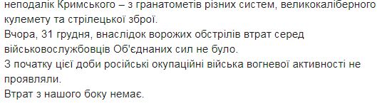 "Вчера, 31 декабря, в результате вражеских обстрелов потерь среди военнослужащих Объединенных сил не было. С начала суток российские оккупационные войска огневой активности не проявляли. Потерь с нашей стороны нет", - говорится в сообщении.