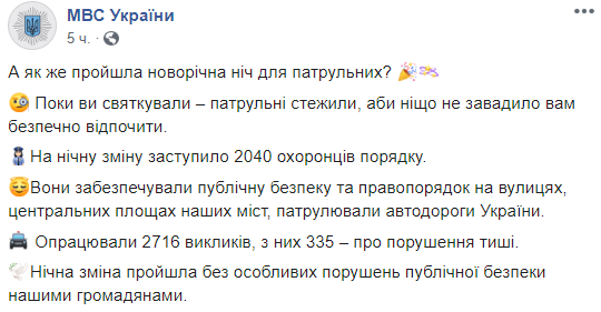В новогоднюю ночь за правопорядком в украинских городах следили 2040 сотрудников МВД, на улицы Украины вывели дополнительные наряды полиции и Нацгвардии. В целом ночь прошла без особых нарушений публичной безопасности украинцами. Об этом сообщили в пресс-службе Министерства внутренних дел в Facebook.