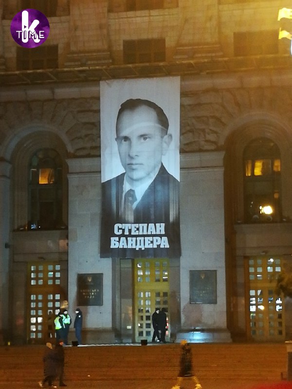 На здании Киевской городской государственной администрации в честь 111 годовщины со дня рождения украинского политического деятеля и организатора украинского националистического движения на Западной Украине Степана Бандеры повесили баннер с изображением главы ОУН.