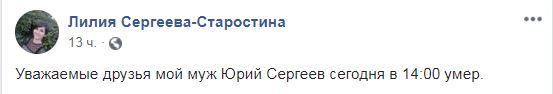 "Уважаемые друзья, мой муж Юрий Сергеев сегодня в 14:00 умер", - сообщила она.