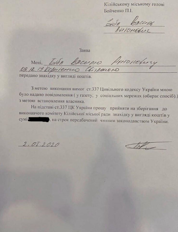 "Учитывая то, что сразу несколько жителей села заявили о том, что средства принадлежат именно им, но доказать это никто из них не смог, согласно требованиям законодательства настоятель храма отец Василий передал средства на хранение. В течение шести месяцев средства будут храниться. Если за это время не будет установлен владелец средств, в соответствии с требованиями законодательства, право распорядиться деньгами предоставят человеку, который их нашел", - написал Павел Бойченко и уточнил, что речь идет о сумме не миллион долларов или евро, а несколько тысяч гривен.