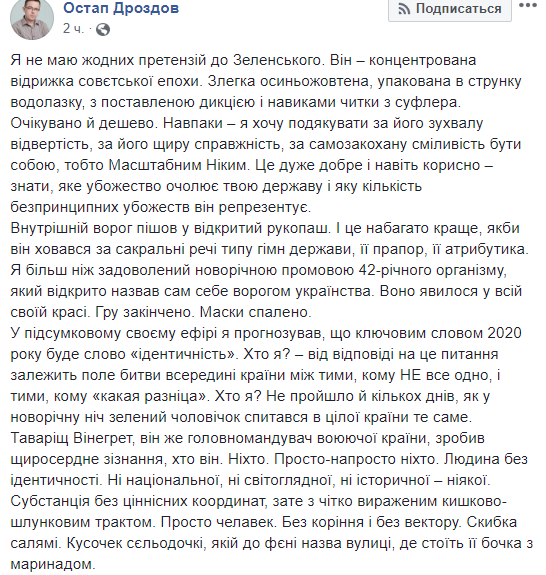 "У меня нет никаких претензий к Зеленскому. Он - концентрированная отрыжка советской эпохи. Слегка иссиня желтая, упакованная в стройную водолазку, с поставленной дикцией и навыками читки с суфлера. Ожидаемо и дешево. Наоборот - я хочу поблагодарить за его вызывающую открытость, за его искреннюю подлинность, по самовлюбленную смелость быть собой, то есть Масштабным Никем. Это очень хорошо и даже полезно - знать, какое убожество возглавляет твое государство и количество беспринципных убожеств он представляет", - начал свой пост Дроздов.