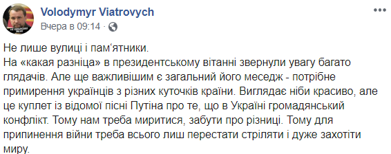 "На "какая разница" в президентском поздравлении обратили внимание многие зрители. Но еще важнее общий его месседж - нужно примирение украинцев из разных уголков страны. Выглядит вроде как красиво, но это куплет из известной песни Путина о том, что в Украине гражданский конфликт. Поэтому нам надо мириться, забыть о разнице. Поэтому для прекращения войны надо всего лишь перестать стрелять и очень захотеть мира", - иронизирует бывший глава Института нацпамяти.