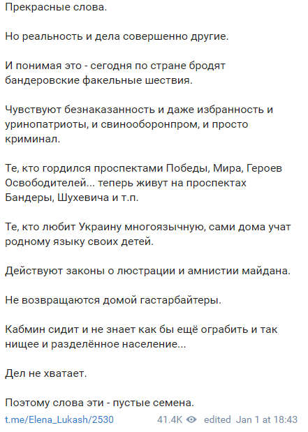 "Сегодня по стране бродят бандеровские факельные шествия. Чувствуют безнаказанность и даже избранность и уринопатриоты, и свинооборонпром, и просто криминал.