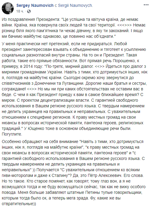 Особенно обращают на себя внимание "Навіть з тими, хто дотримується інших, ніж я, поглядів на майбутнє країни", "к праву местных громад на свои нюансы в вопросах исторической памяти, пантеона героев" и "с гарантией свободного использования в Вашем регионе русского языка. С твердым намерением не делить украинцев на правильных и неправильных" )) Получается "С уважительным отношением ко всяким гиви-моторолам и даже к Сталину"? Да, это Пётр Алексеевич. Его слова. Но то такое. Кто старое помянет, как говорят, тому глаз вон, а я не возмущался тогда и не буду возмущаться сейчас, так как не вижу особого повода. Меня больше забавляют штатные Петины тупые говорильщики, которым тогда было ок, а теперь мега зрада. Фу, какие же вы отвратительные".