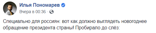 "Специально для россиян: вот как должно выглядеть новогоднее обращение президента страны! Пробирало до слёз", - пишет экс-депутат Госдумы Илья Пономарев.