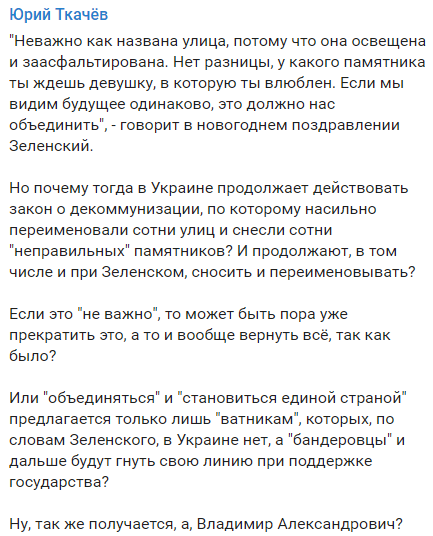 "Неважно как названа улица, потому что она освещена и заасфальтирована. Нет разницы, у какого памятника ты ждешь девушку, в которую ты влюблен. Если мы видим будущее одинаково, это должно нас объединить", - говорит в новогоднем поздравлении Зеленский.