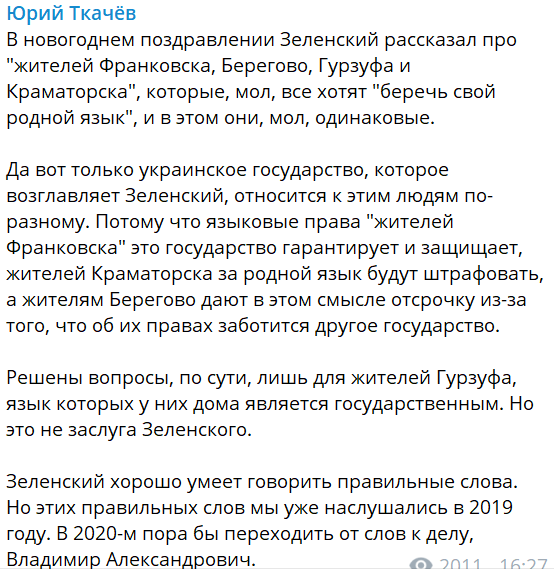 "В новогоднем поздравлении Зеленский рассказал про "жителей Франковска, Берегово, Гурзуфа и Краматорска", которые, мол, все хотят "беречь свой родной язык", и в этом они, мол, одинаковые.