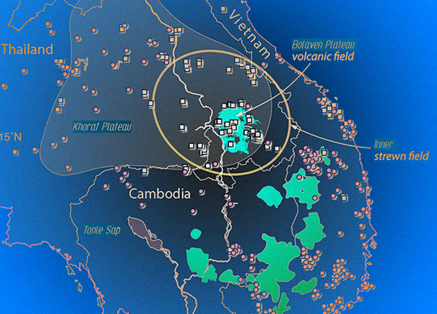 В наши дни геологи из Сингапура, США, Таиланда и Лаоса пришли к выводу, что связанный с австралазийским полем кратер погребен под слоями застывшей лавы на территории плато Боловен в южной части Лаоса.