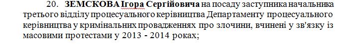 Он занял должность заместителя начальника третьего отдела процессуального руководства департамента процессуального руководства по уголовным производствам о преступлениях, совершенных в связи с массовыми протестами в 2013–2014 годах. Земсков сказал, что продолжит работать над делами Майдана.