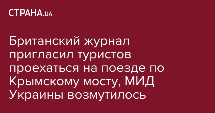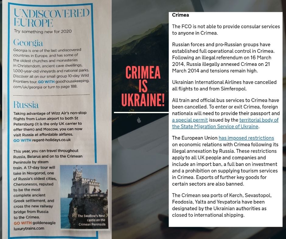 В очерке журнала под названием "Неизведанная Европа: попробуй что-то новое в 2020 году", фото которого опубликовало украинское посольство в Великобритании, рассказывается о том, как можно попасть в Крым на поезде через Россию по недавно открытому Керченском мосту. Иллюстрируется статья фотографией Ласточкиного гнезда - крымского архитектурного памятника.
