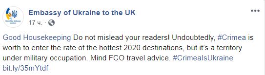 "Good Housekeeping, не вводите в заблуждение своих читателей! Бесспорно, Крым стоит того, чтобы войти в рейтинг исследований самых горячих направлений 2020 года, но это территория под военной оккупацией", - говорится в сообщении.