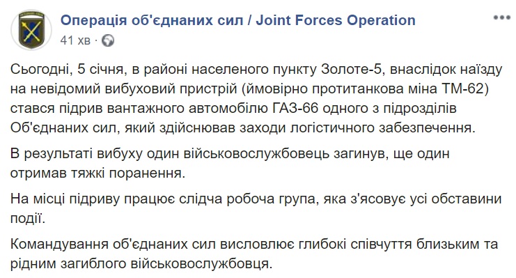 Сегодня на Донбассе в районе населенного пункта Золотое-5 в результате наезда на неизвестное взрывное устройство (вероятно, противотанковая мина ТМ-62) произошел подрыв грузового автомобиля ГАЗ-66 одного из подразделений Объединенных сил, который осуществлял мероприятия логистического обеспечения. Об этом сообщает штаб ООС.