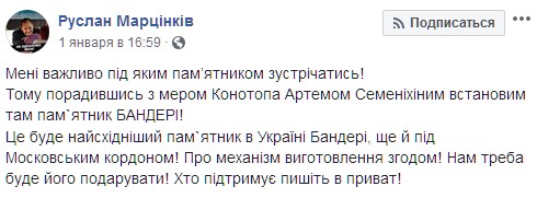 "Мне важно под каким памятником встречаться! Поэтому, посоветовавшись с мэром Конотопа, Артемом Семенихиным - установим там памятник Бандере! Это будет самый восточный памятник в Украине Бандере, еще и под Московским рубежом! О механизме изготовления впоследствии! Нам надо будет его подарить! Кто поддерживает - пишите в приват!", - говорится в сообщении.