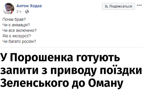 Представители политсилы экс-президента Петра Порошенко "Европейская солидарность" готовят запросы в Офис президента и МИД по поводу внезапной поездки главы государства Владимира Зеленского в Оман. Об этом на своей странице в соцсети заявила соратница экс-президента Иванна Климпуш-Цинцадзе.