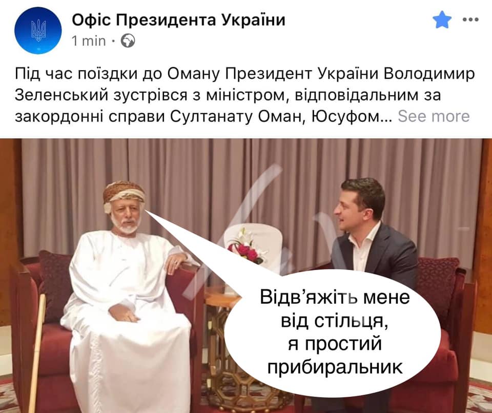В то же время было понятно, что на Банковой просто пытаются выкрутиться из неудобной ситуации. Поэтому Сеть заполонили мемы на встречи президента с оманскими лидерами - да и вообще на тайный отъезд Зе.