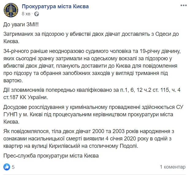 Задержанных по подозрению в убийстве двух девушек доставят из Одессы в Киев. Об этом информирует пресс-служба прокуратуры города Киева.