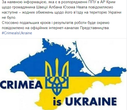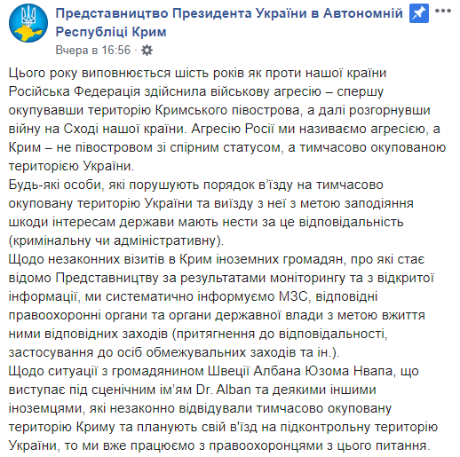 "О ситуации с гражданином Швеции Албаном юзом Нвапом, выступающим под сценическим именем Dr. Alban и некоторыми другими иностранцами, которые незаконно посещали временно оккупированную территорию Крыма и планируют свой въезд на подконтрольную территорию Украины, мы уже работаем с правоохранителями по этому вопросу. По имеющейся информации, имеющейся в распоряжении ППУ в АР Крым в отношении гражданина Швеции Албана юзом Нвапа, сообщаем следующее - никаких ограничений по его въезду на территорию Украины не было", - говорится в сообщении.