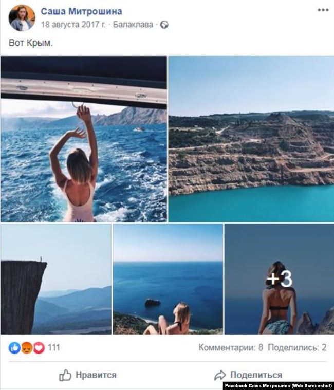 Отметим, что известная российская блогер Александра Митрошина посещала Крым после аннексии, судя по фото в ее соцсети.