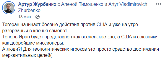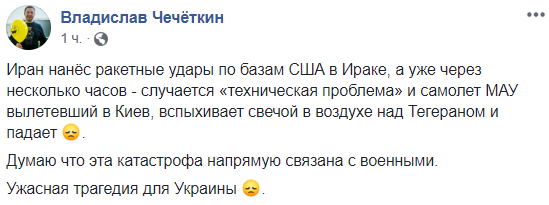 "Ужасная история с падением Boeing 737-800, особенно учитывая параллельный ракетный обстрел Ираном военной базы в США и закрытие американцами воздушного пространства над Ираном и Ираком, выглядит подозрительно", -пишет Арьев.