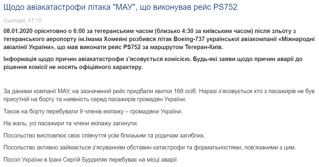 12:20 На сайте посольства Украины в Иране появился отредактированный текст о катастрофе. Там уже нет слов о том, что это не теракт и не ракета.