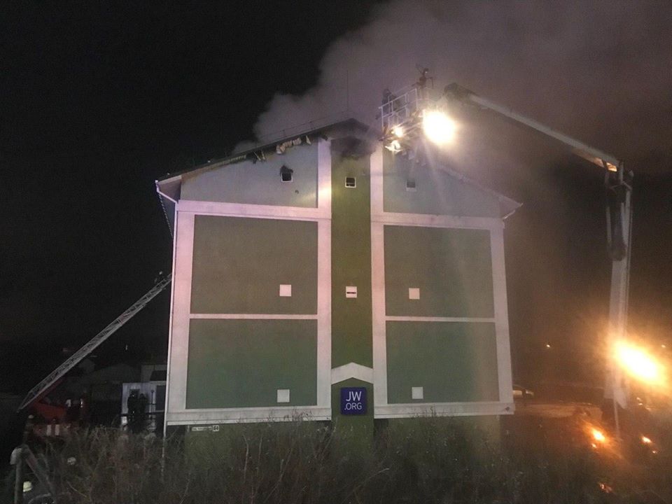 По предварительным данным пострадавший 1977 года рождения пытался самостоятельно ликвидировать возгорание. Мужчину был госпитализирован. На фото с места ЧП видна надпись "Зал царства свидетелей Иеговы" - здания для встреч собрания этой религиозной общины.