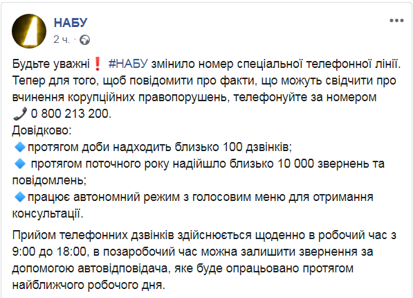 "Прием телефонных звонков осуществляется ежедневно в рабочее время с 9:00 до 18:00, в нерабочее время можно оставить сообщение на автоответчике, которое будет обработано в ближайший рабочий день", - сказано в соцсети НАБУ.