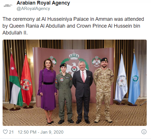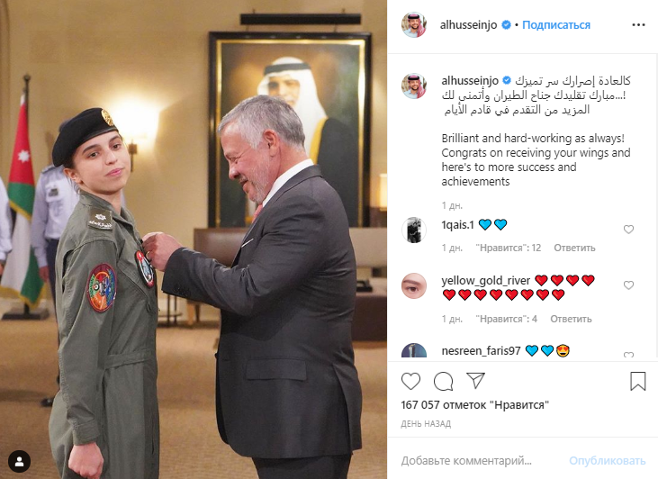 19-летняя девушка закончила обучение пилотов на самолетах. На церемонии вручения соответствующей награды присутствовали королева Рания и ее старший брат, принц Хуссейн. Брат девушки является первым лейтенантом в Вооруженных силах. В Instagram он поздравил сестру с успешным завершением обучения. "Блестящая и трудолюбивая, как всегда! Поздравляю с получением своих крыльев. Еще больше успехов и достижений", – написал он.