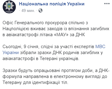 "Образцы будут обработаны в течение суток, а ДНК-формула направлена в электронном виде в Тегеран для идентификации тел", - сообщается на странице Нацполиции в соцсети Facebook.