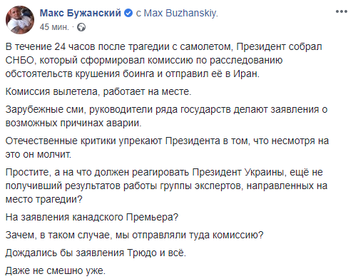 "Зачем Зеленский сказал, что Трамп лжец? Сегодня команда Зе и те, кто рядом, завели новую шарманку: не говорить ничего о сбитом ракетой самолет - это мудро. Лучше выражение, я слышал по этому поводу - надо набраться терпения. Еще мне очень нравится аргумент, что Трюдо имел право что-то говорить, потому что там погибли канадцы. Но это так, пипл может и схавает.
