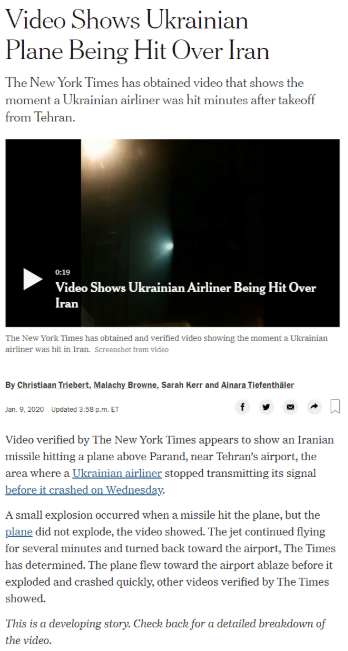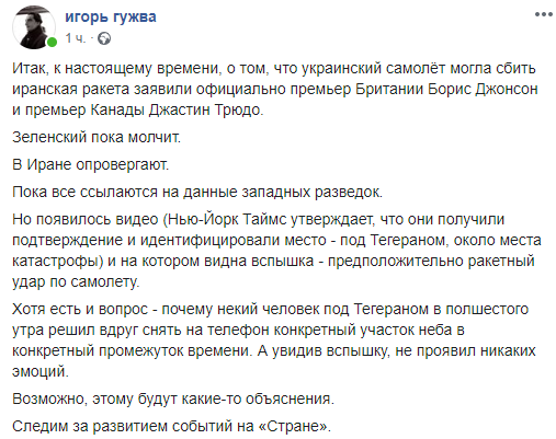 "Итак, к настоящему времени, о том, что украинский самолёт могла сбить иранская ракета заявили официально премьер Британии Борис Джонсон и премьер Канады Джастин Трюдо.