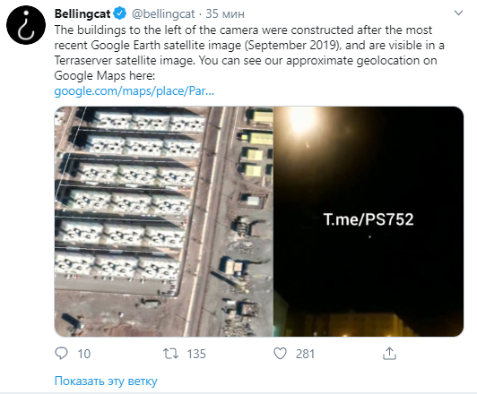"Здания слева от камеры были построены по последнему спутниковому снимку Google Планета Земля (сентябрь 2019 г.) и видны на спутниковом снимке Terraserver. Вы можете увидеть наше приблизительное местоположение на Картах Google здесь: (Parand, Tehran Province, Iran)", - говорится в сообщении Bellingcat в Twitter.