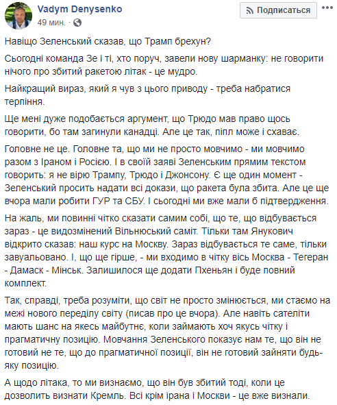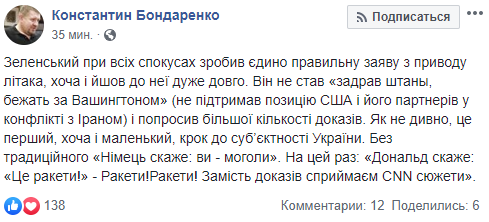 "Зеленский при всех искушениях сделал единственно правильное заявление по поводу самолета, хотя и шел к нему очень долго. Он не стал "задрав штаны, бежать за Вашингтоном" (не поддержал позицию США и его партнеров в конфликте с Ираном) и попросил большего количества доказательств. Как ни странно, это первый, хотя и маленький, шаг к субъектности Украины. Без традиционного "Немец скажет: вы - монголы". На этот раз "Дональд скажет:" Это ракеты" - Ракеты! Ракеты! Вместо доказательств воспринимают CNN сюжеты", - счита