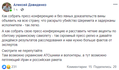 Смотрите не перепутайте. Там, возможно, украинские АТОшники и волонтеры, а тут возможно петляющий Иран и российская ракета", - пишет Давиденко.