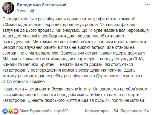 "Учитывая последние заявления лидеров государств в СМИ, мы призываем всех международных партнеров - прежде всего правительства США, Канады и Великобритании - предоставить данные и доказательства, касающиеся катастрофы, в распоряжение комиссии по расследованию причин", - сказал Зеленский.